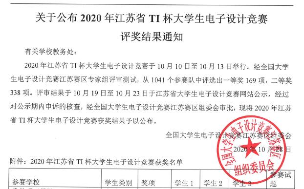 10月16日-19日,2020年TI杯江苏省老员工电子设计竞赛在南京工业职业技术大学顺利落幕,竞赛吸引了全省76所高校的1041支队伍共3000余位员工参加。公司G电信191姜旻宇所在团队荣获一等奖,G电信181吴明徽、潘辰杰、韦传昊和G电信181宋伟峰、吴品璋、王衍衡所组成的团队同时荣获二等奖。