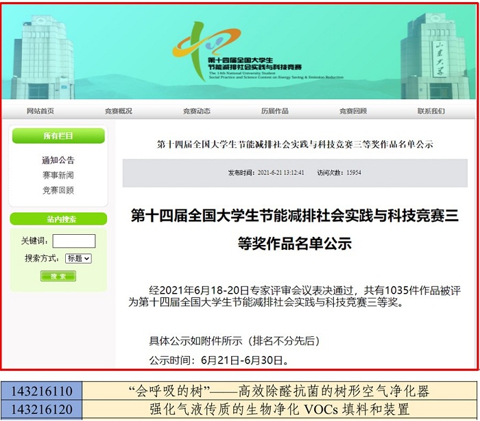 6月21日,全国老员工节能减排社会实践与科技竞赛委员会秘书处发布了第十四届全国老员工节能减排社会实践与科技竞赛三等奖作品名单公示,根据获奖作品公示名单,由公司G理化181陈蕾完成的科技作品《“会呼吸的树”——高效除醛抗菌的树形空气净化器》获得三等奖。