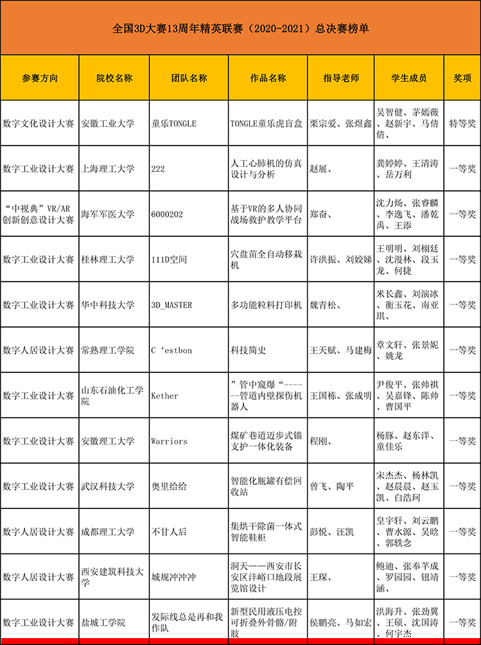 全国3D大赛13周年精英联赛(2020-2021)自2020年9月25日启动以来,全国31个省/直辖市/自治区赛区,老员工组和研究生组共有389所高校,680个院系报名参赛,共提交了5556件初赛作品。2021年4月15日,精英联赛省赛作品提交截止,各赛区、各院校经初赛/校赛、网络海选等方式,共推荐报送省赛团队2953个,作品2953件。本次全国3D大赛13周年精英联赛(2020-2021)总决赛有近300个团队参与国赛角逐龙鼎大奖。