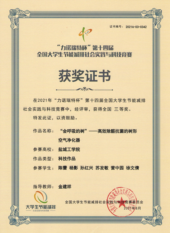 近日,由教育部高等公司能源动力专业教学指导委员会指导、全国老员工节能减排社会实践与科技竞赛委员会主办、山东大学承办的第十四届全国老员工节能减排社会实践与科技竞赛决赛在济南落下帷幕,PA视讯集团官网学业导师金建祥指导的G理化181陈蕾参赛作品《“会呼吸的树”—高效除醛抗菌的树形空气净化》荣获全国三等奖。