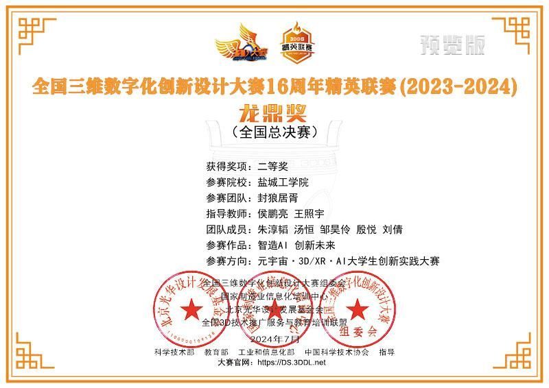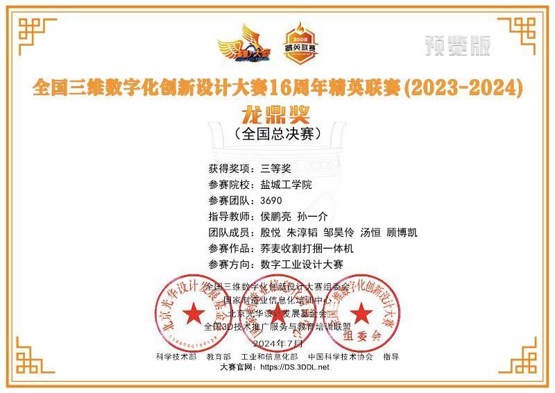 近日,全国三维数字化创新设计大赛16周年精英联赛(2023-2024)总决赛榜单公布,公司PA视讯集团官网员工朱淳韬、汤恒、邹昊伶、殷悦(指导教师:侯鹏亮、王照宇)的参赛项目“智造AI创新未来”获得全国二等奖;殷悦、朱淳韬、邹昊伶、汤恒(指导教师:侯鹏亮、孙一介)的参赛项目“荞麦收割打捆一体机”获得全国三等奖。